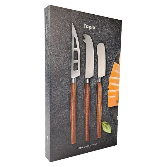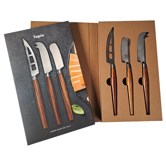 Tyylikäs ja käytännöllinen juustoveitsisetti, joka sopii täydellisesti niin juustotarjottimelle kuin lahjaksi juustonystävälle. Ruostumattomasta teräksestä valmistetut terät ja FSC-sertifioidusta akaasiapuusta valmistetut kahvat. Veitset toimitetaan kirjatyylisessä laatikossa, koko 29,2 x 17,5 x 2,6 cm.