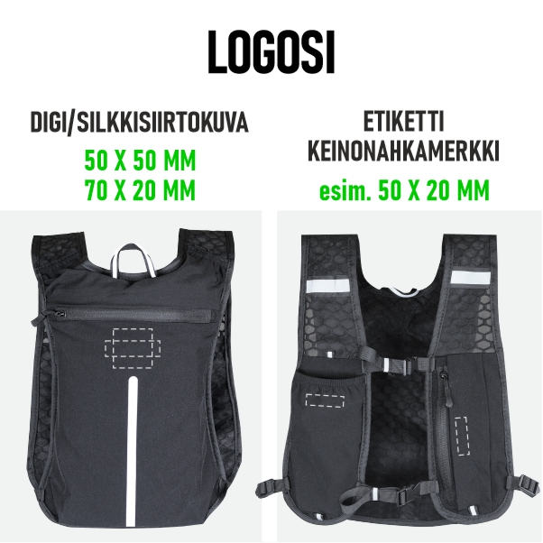 Liivin etupuolella vetoketjullinen tasku puhelimelle tai pienille tarvikkeille sekä pullotasku. Selkäpuolella on 3,5 L vetoketjullinen tasku, johon mahtuu esimerkiksi 1,5 L juomarakko tai pieni paino.