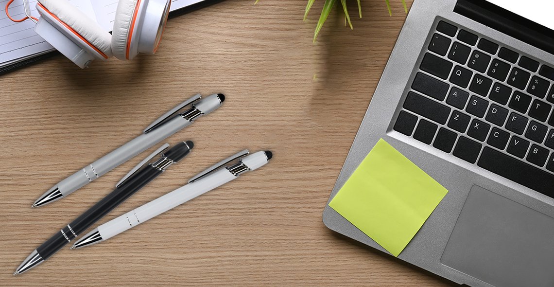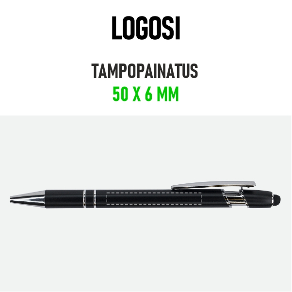Tyylikäs ja monikäyttöinen kosketusnäyttökynä, jossa yhdistyvät perinteisen kuulakärkikynän käytännöllisyys ja moderni kosketusominaisuus. Kynässä on kestävä alumiinirunko ja kätevä klipsi, joka pitää sen helposti mukana. Musta kuminen kosketusnäyttöpää toimii sujuvasti kaikilla kosketusnäytöillä, ja 1 mm kuulakärki tuottaa tasaisen sinisen mustejäljen. Paino: 18 g. Koko: 145 × 10 × 15 mm.