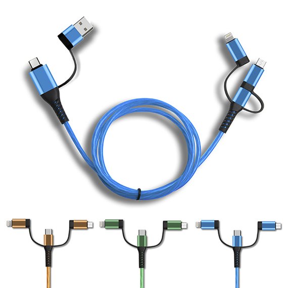 5-in-1 LED-latauskaapeli metallisilla pistokkeilla. Nopea 3A latausnopeus USB/Type C -yhdistelmäliittimellä iPhone Lightningille, micro USB:lle ja Type C:lle. Kaapelin pituus 100 cm. Tuote on pakattu mustaan mikrokuitupussiin. Värit: sininen, vihreä ja oranssi.