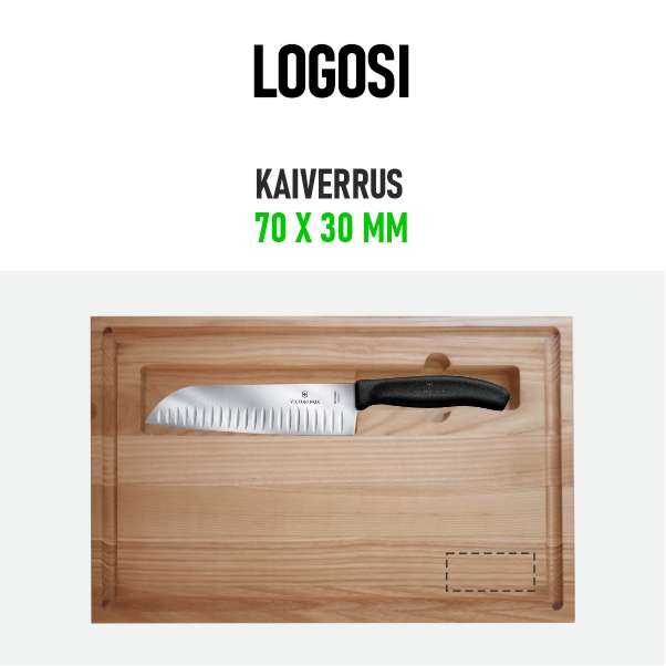 Saarnista valmistettu leikkuulauta on täydellinen kumppani keittiössäsi. Laudassa on paikka 17 cm Victorinoxin Santoku -veitselle, ja sen ulkoreunaa kiertävä ura kerää kätevästi lihojen ja hedelmien käsittelyssä syntyvät nesteet. Leikkuulaudan koko on 388 x 245 x 25 mm. Vain käsinpesu. Puiset leikkuulaudat tarvitsevat säännöllistä öljyämistä, jotta niiden pinta säilyy ja ne eivät kuivu. Varmista, että käytät elintarvikekäyttöön soveltuvaa öljyä ja että tuote on kunnolla puhdas ja kuiva ennen öljyämistä. Pese tuote käsin.