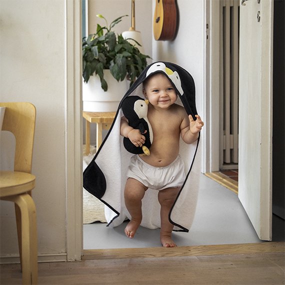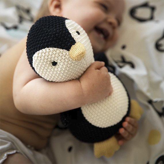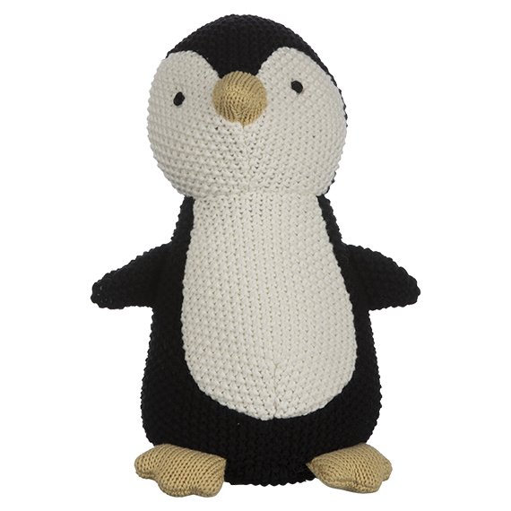 Pingviiniä ei yleensä tapaa pohjoisen luonnossa, mutta lasten maailmassa kaikki on mahdollista. Sympaattinen mustavalkoinen pingviini on Minna Niskakankaan suunnittelema. Pingviini-neulelelu on kooltaan 23 cm ja se on 100% puuvillaa. Täyte on polyesteria.