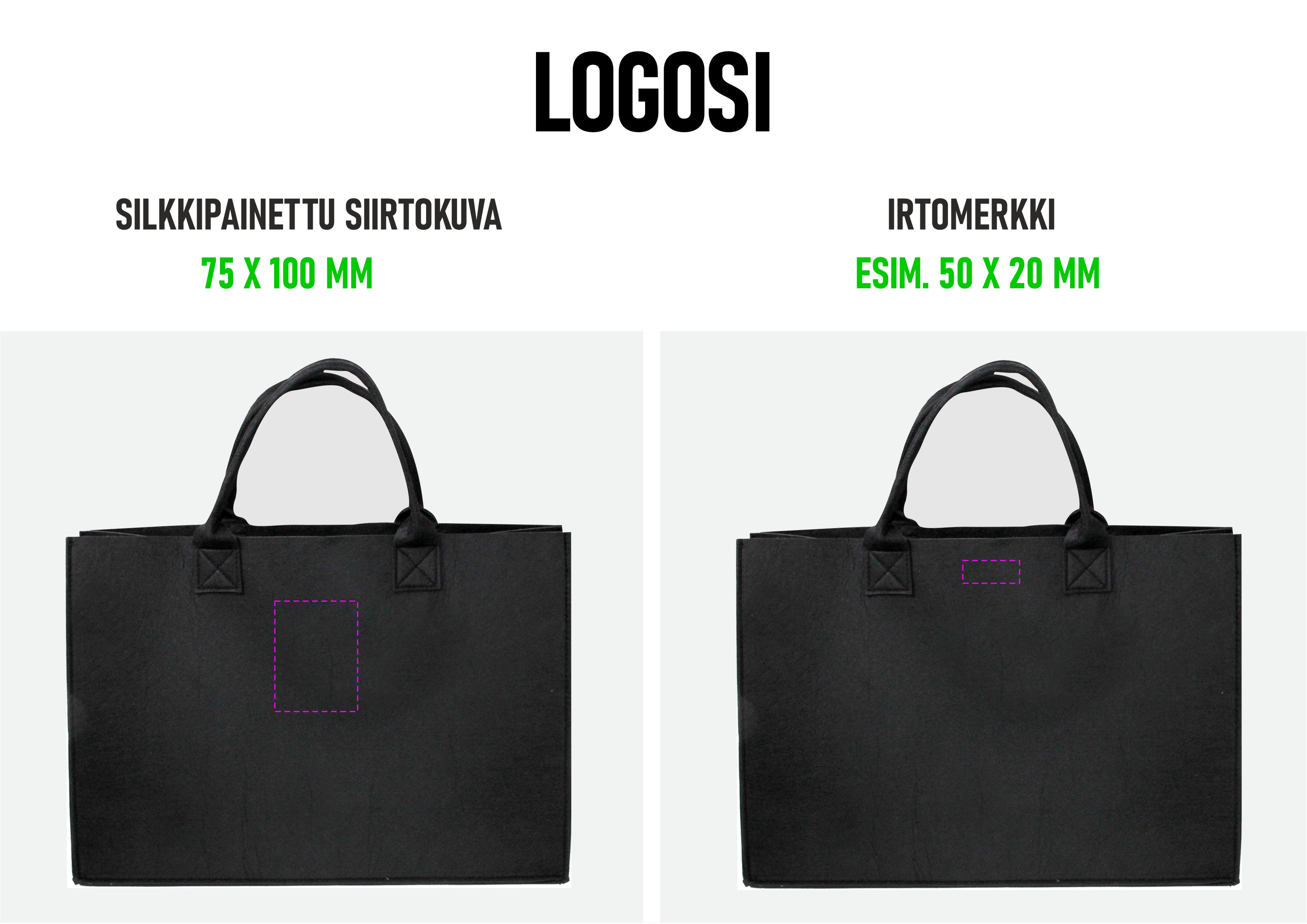 Kierrätysmuovista valmistettu huopakassi on kevyt ja kestävä. Sen valmistukseen on käytetty 14 kappaletta 0,5 litran PET-pulloa. Se on loistava lahjakassi, messukassi ja ostoskassi, jonka voi logopainettuna jakaa ylpeydellä asiakkaille ja henkilökunnalle. Tämä kassi jää jokaiselle varmasti myös aktiiviseen käyttöön, sillä se on tukeva ja reilun kokoinen. Kassin materiaali on 2 mm paksua huopaa, joka on taitettu kantokahvojen kohdalta kaksin kerroin. Kassin leveys 46 cm, korkeus 32 cm ja pohjalevikkeen syvyys 16,50 cm.
