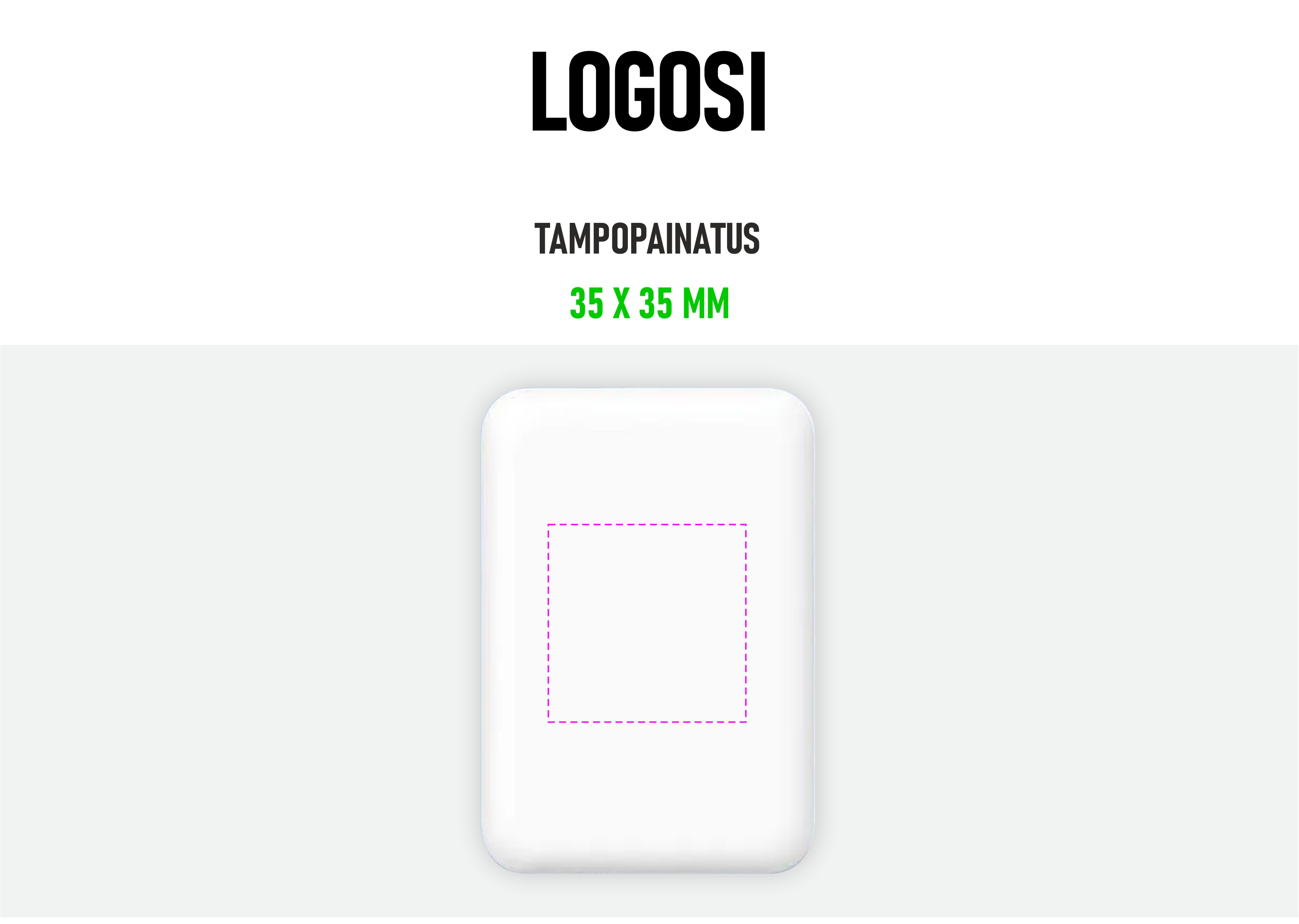 Näppärän kokoinen langaton 5000 mAh power bank sopii täydellisesti toimistolle tai kotiin yöpöydälle. Laite toimii kahdella eri tavalla: puhelimeen kiinnittyvällä magneetilla tai langattomana latausalustana. Laitteessa langaton 5 W laturi, Type-C ja Micro USB. Mitat 91 x 64 x 15 mm, latauskaapelin koko 30 cm.